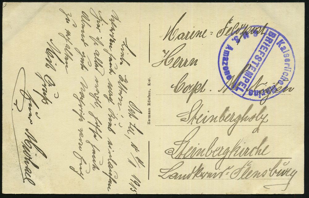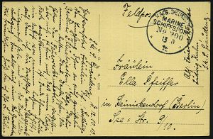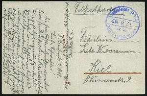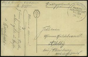 657 | 18 € | I.WELTKRIEG: DEUTSCHE MARINESCHIFFSPOST 1914 -18 : Marine-Schiffspost no. 70 1914 (28.10.) viol. 1K-Brücken-Briefstpl.: Kaiserliche Marine/S.M.S. Amazone (= MSP No.70) Kleiner Kreuzer, Flaggschiff der Küstenschutz-Division Ostsee + Band-MaSt.: KIEL/* 1 ff + hs. Abs. "Kiel", klar gest. s/w.-Feldpost-Ak.: Unsere Helden.. Mannschaft des U-Bootes "U 9" (Weddingen) mir Eisernen Kreuzen n. Steinbergholz | ![]() ![]() | |