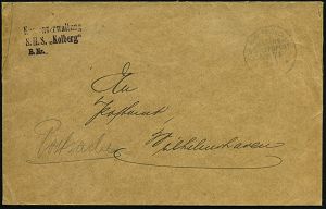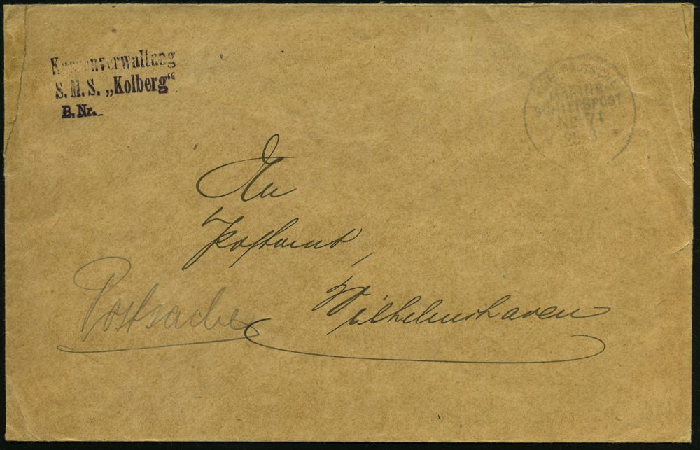661 | 15 € | I.WELTKRIEG: DEUTSCHE MARINESCHIFFSPOST 1914 -18 : Marine-Schiffspost No. 71 1916 (25.3.) 1K-BPA: KAIS. DEUTSCHE/MARINE-/SCHIFFSPOST/No. 71 = S.M.S. "Kolberg", Kleiner Kreuzer, meist Ostsee-Einsatz , viol. 3L: Kassenverwaltung/S.M.S. "Kolberg".. (Bf. links u. rechts Öffnungsrisse) Marine-Postzdienst-Bf. n. Wilhelmshaven | ![]() | |