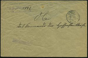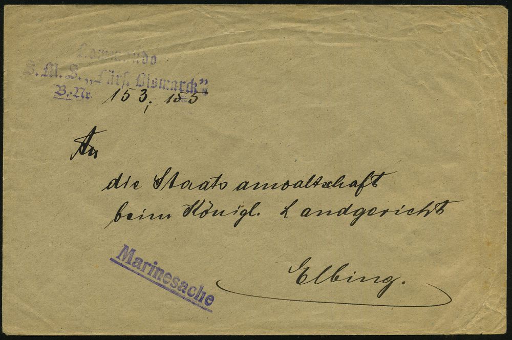676 | 25 € | I.WELTKRIEG: DEUTSCHE MARINESCHIFFSPOST 1914 -18 : Marine-Schiffspost No. 98 1914 viol. 3L: Kommando/S.M.S. "Fürst Bismarck".. (= MSP No.98, ab Dez. 1915 MSP No.216) Großer Kreuzer, Postausrüstung ab 20.1.1915 (rs. ertw. unsauber geöffnet) seltener Marine-Dienstbf. n. Elbing | ![]() | |