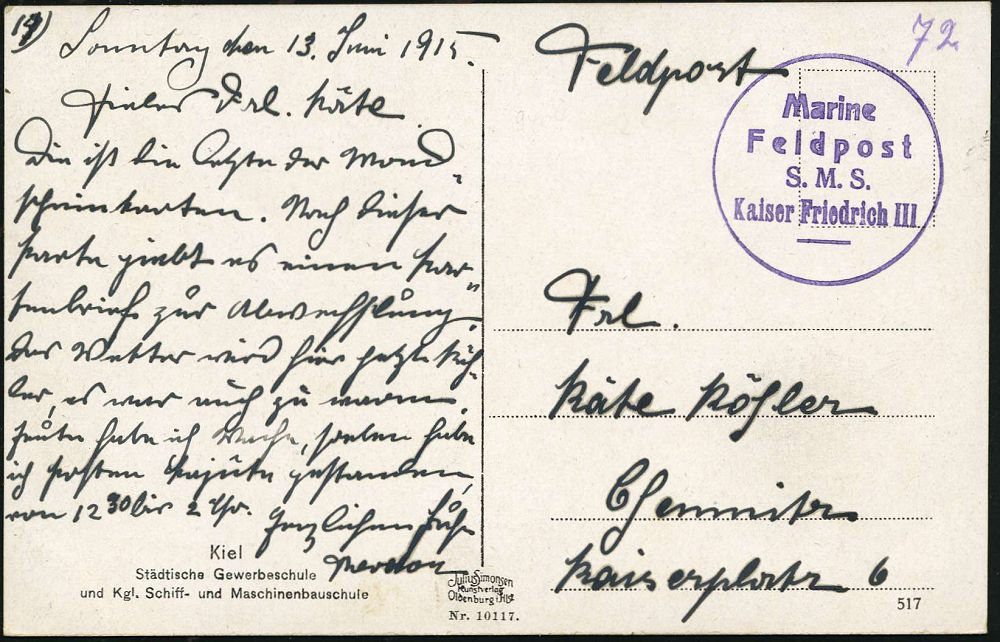 653 | 25 € | I.WELTKRIEG: DEUTSCHE MARINESCHIFFSPOST 1914 -18 : Marine-Schiffspost No. 64 1915 (13.6.) viol. 1K-Briefstempel: Marine/Feldpost/S.M.S./Kaiser Friedrich III. = Linienschiff ,ab 6.3.1915 Kieler Hafenverteidigung, ab April Schul- u. Ausbildungsschiff, glasklar gest. Feldpost-Ak: Schiff- u. Marinebauschule Kiel n. Chemnitz, seltene Verwendungszeit! | ![]() ![]() | |