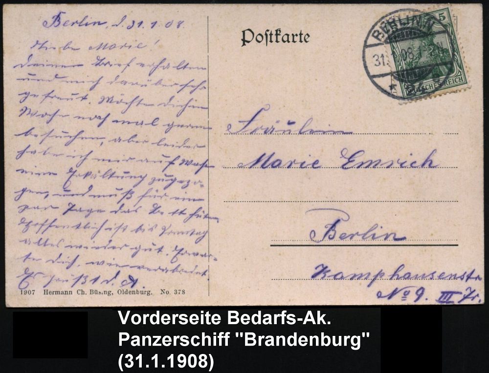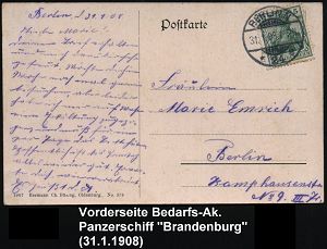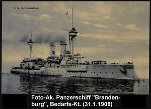 682 | 12 € | I.WELTKRIEG: DEUTSCHE MARINESCHIFFSPOST 1914 -18 : Marine-Schiffspost No. 105 1908 (31.1.) monochrome Foto-Ak.: "S.M.S. Brandenburg" (= MSP No.105), Linienschiff , 1K-Gitter: BERLIN N/* 24 e + Fotokopie Schiffs-Biographie, Bedarfs-Kt. (Mi.85 I) | ![]() ![]() | |