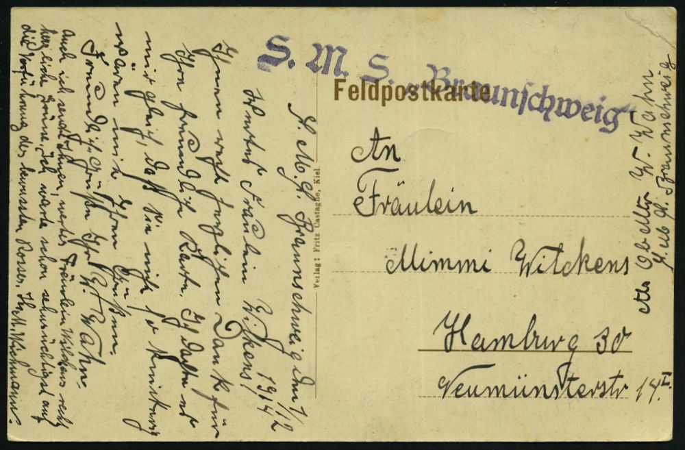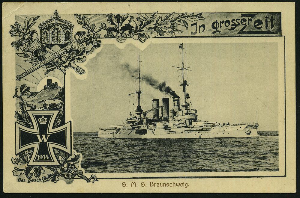 693 | 20 € | I.WELTKRIEG: DEUTSCHE MARINESCHIFFSPOST 1914 -18 : Marine-Schiffspost No. 132 1914 (1.12.) viol. 1L: S.M.S. Braunschweig (= MSP No. 132) Linienschiff, Flaggschiff des 2. Admirals der Hochseeflotte , hs. Abs.: "..S.M.S. Braunschweig", klar gest., patriotische Feldpost-Ak.: S.M.S. Braunschweig (kl. Eckbug) n. Hambg., schöne Kombination! | ![]() ![]() | |