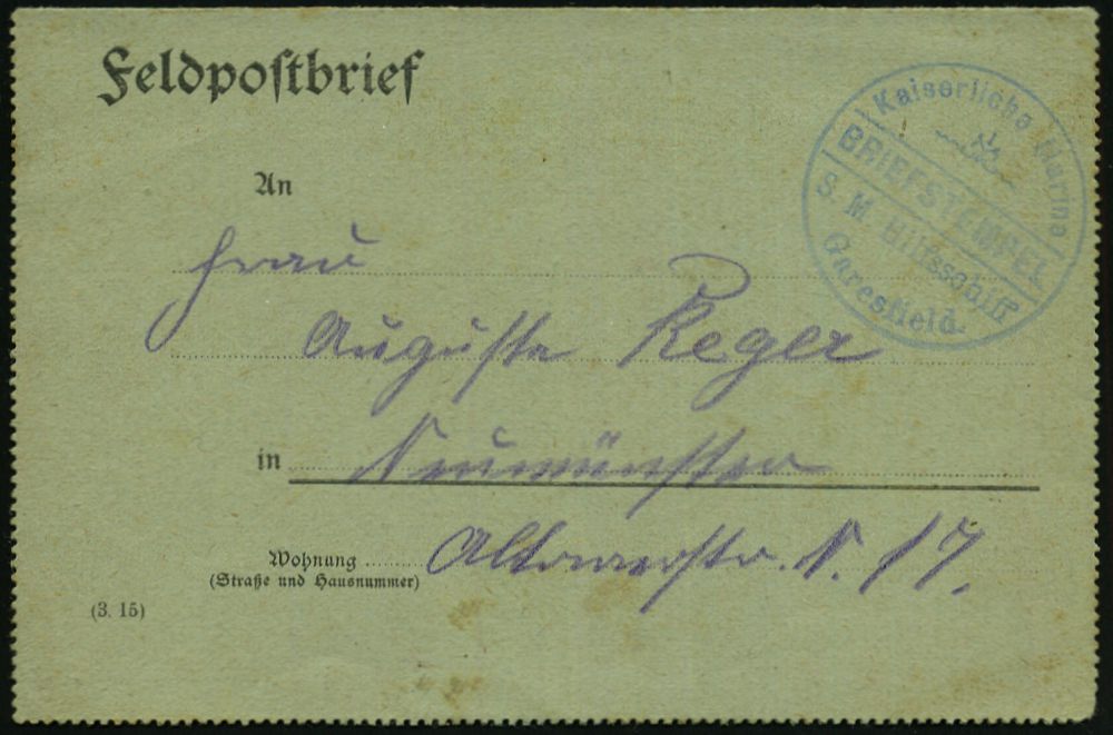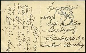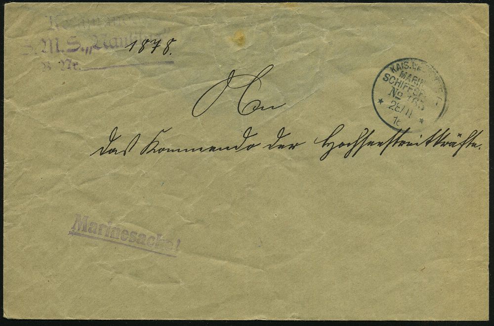 727 | 30 € | I.WELTKRIEG: DEUTSCHE MARINESCHIFFSPOST 1914 -18 : Marine-Schiffspost No.207 1915 (6.4.) roter 1K-Brücken-Briefstempel: Kaiserliche Marine/Kommando/S.M.S. "Seydlitz" (= MSP No.207 bzw. MSP No.36/36 a) Schlachtkreuzer, Flaggschiff I. Aufklärungsgruppe + hs. Abs.: "S.M.S. Seydlitz", klar gest. s/w.-Feldpost-Ak.: S.M. Linienschiff Schleswig Holstein n. Böcklund, Briefstempel ist selten! | ![]() ![]() | |