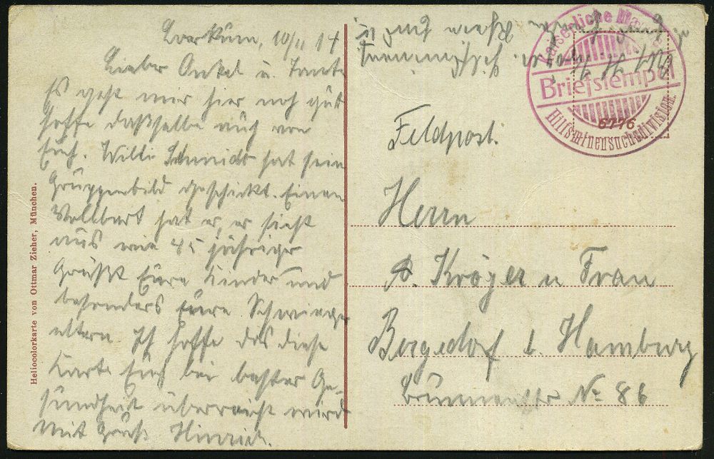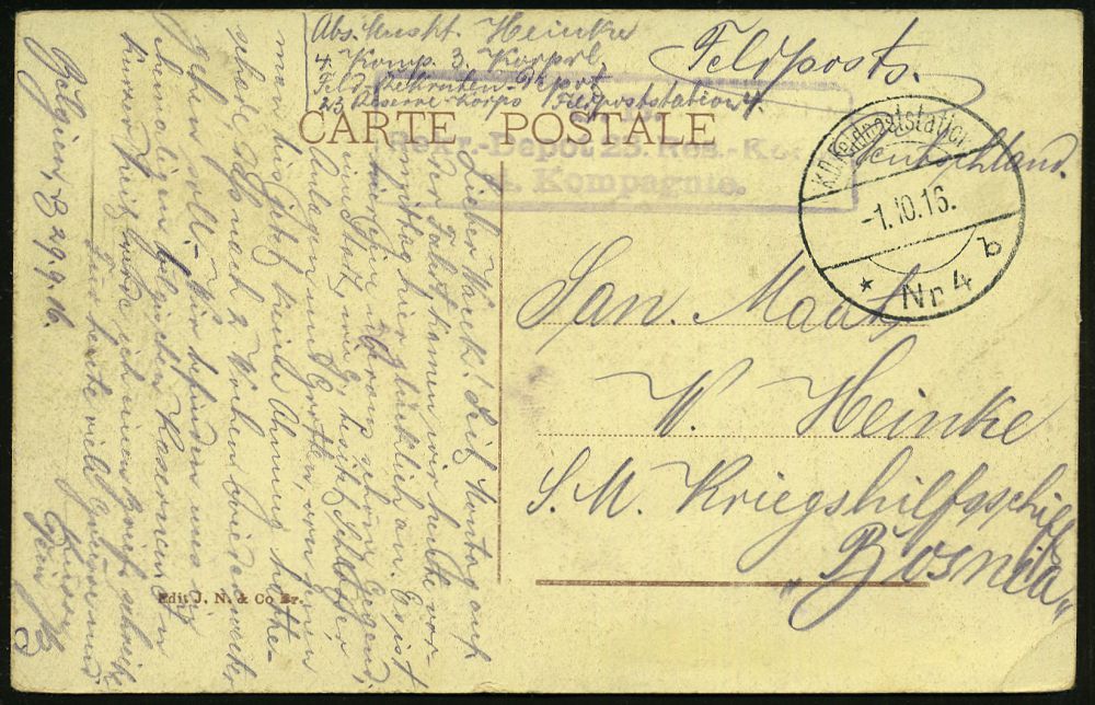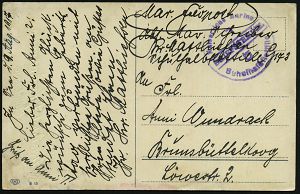 716 | 15 € | I.WELTKRIEG: DEUTSCHE MARINESCHIFFSPOST 1914 -18 : Marine-Schiffspost No. 176 1916 (1.10.) Feldpost-Ak. (Gent) an "S.M. Kriegshilfsschiff Bosnia" (= MSP No.176) = Werkstattschiff, stationiert in Cuxhaven , 1K-Brücke: K. D. Feldpoststation/* Nr 4 b (Kat.Nr.1570 I) + viol. Ra., klar gest. Feldpost-Kt. aus Belgien, vergl. Los Nr. 717 | ![]() ![]() | |