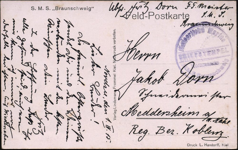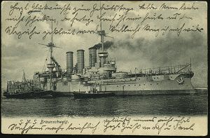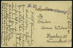 695 | 20 € | I.WELTKRIEG: DEUTSCHE MARINESCHIFFSPOST 1914 -18 : Marine-Schiffspost No. 132 1915 (1.4.) viol. 2K-Brücken-Briefstempel: Kaiserliche Marine/ Kommando/ S.M.S. Braunschweig (= MSP No. 132) Linienschiff + hs. Abs. "F G Meister S.M.S. Braunschweig", sauber gest. Color-Künstler-Feldpost-Ak. des Schiffes! (S.M.S. Braunschweig) sign. Lindemann-Frommel, Kiel n. Heddersheim = letzter Tag Briefstempel-Verwendung! (ab 1.4.1915 Postausrüstung!) | ![]() ![]() | |