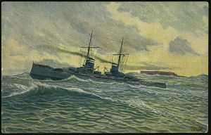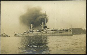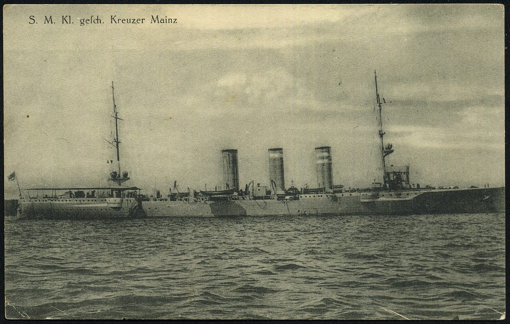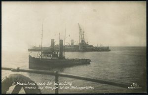 632 | 18 € | I.WELTKRIEG: DEUTSCHE MARINESCHIFFSPOST 1914 -18 : Marine-Schiffspost No. 31 1918 (ca.) monochrome Foto-Ak.: Kl. Kreuzer "Mainz" (= MSP No. 31) brennend während dem Untergang.. (+ unten engl. Text) Gefecht bei Helgoland Aug. 1914. sign. W. Krüger, Rüstringen, ungebr., selten! | ![]() | |