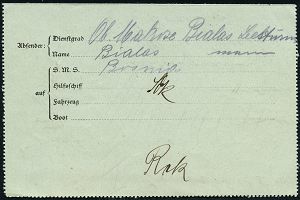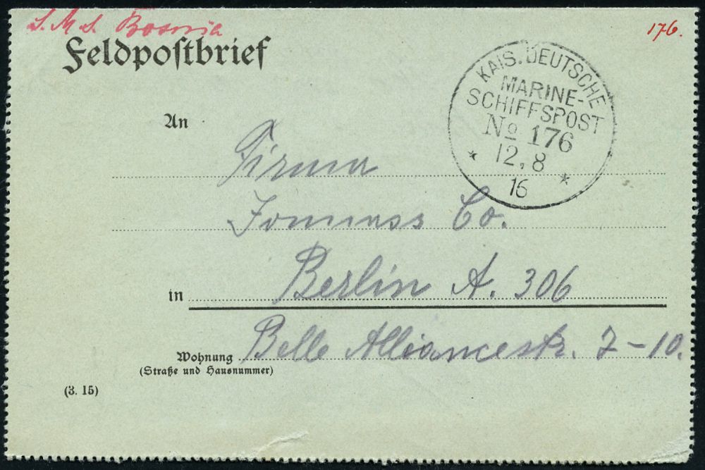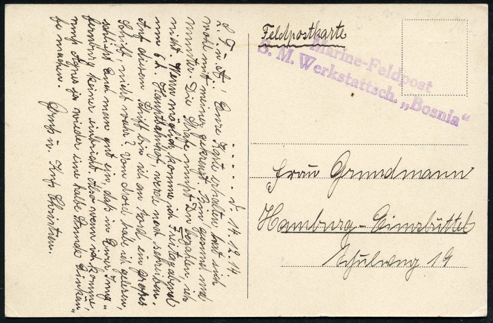 717 | 40 € | I.WELTKRIEG: DEUTSCHE MARINESCHIFFSPOST 1914 -18 : Marine-Schiffspost No. 176 1914/16 1K-BPA: KAIS. DEUTSCHE/MARINE-/SCHIFFSPOST/No. 176 = Werkstattschiff S.M.S. "Bosnia" , kleiner Feldpost-Falt-Bf. mkit Inhalt (rs. hs. Abs. + monochrome Feldpost- Foto-Ak. des Schiffes mit viol. 2L: Marine-Feldpost/ S.M. Werkstattschiff "Bosnia" von 1914, 2 seltene Belege! | ![]() ![]() ![]() ![]() | |