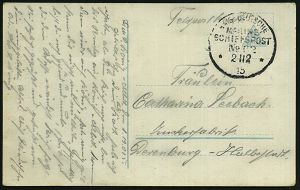 659 | 18 € | I.WELTKRIEG: DEUTSCHE MARINESCHIFFSPOST 1914 -18 : Marine-Schiffspost No. 70 1915 (16.3) 1K-BPA: KAIS. DEUTSCHE/MARINE-/SCHIFFSPOST/No. 70 = S.M.S. "Amazone", Kleiner Kreuzer, Flaggschiff der Küstenschutz-Division Ostsee , patriotische Feldpost-Ak.: Herzog Albrecht von Württemberg aus Kiel n. Steibergkirche | ![]() ![]() | |