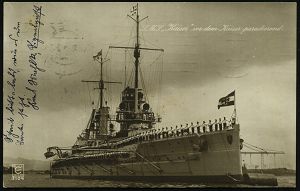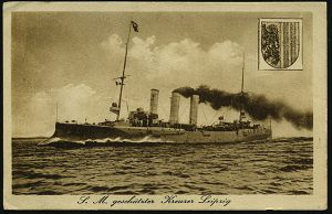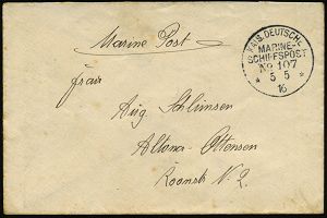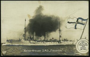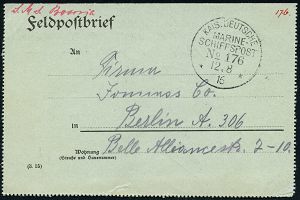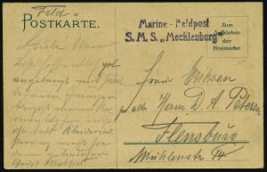687 | 25 € | I.WELTKRIEG: DEUTSCHE MARINESCHIFFSPOST 1914 -18 : Marine-Schiffspost No. 109 1914 viol. 1K-Brücken-Briefstpl.: Kaiserliche Marine/Kommando S.M.S. "Frauenlob" = Kleiner Kreuzer, am 31. Mai 1916 in der Skagerrak-Schlacht gesunken! , hs. Abs.: "S.M.S. Frauenlob, W´haven", dekorative s/w.-Foto-Ak.: Kleiner Kreuzer S.M.S. "Frauenlob".. (mit techn. Daten) n. Neumünster, seltener Beleg! | ![]() ![]() | |