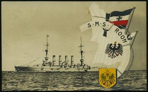 612 | 20 € | I.WELTKRIEG: DEUTSCHE MARINESCHIFFSPOST 1914 -18 : Marine-Schiffspost No. 2 a 1915 (ca.) viol. 1K-Brücken-Briefstpl.: Kaiserliche Marine/Kommando/S.M.S. "Roon" = Gr. Kreuzer , Feldpost-Kitsch-Ak. (Im Liebesboot) n. Flensburg | ![]() ![]() | |