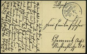 627 | 20 € | I.WELTKRIEG: DEUTSCHE MARINESCHIFFSPOST 1914 -18 : Marine-Schiffspost No. 28 a 1917 (6.3.) 1K-BPA: KAIS. DEUTSCHE/MARINE-/SCHIFFSPOST/No. 28 a = S.M.S. "Baden II", Linienschiff, ab 19.10.1916 im Dienst + hs. Abs.: "..S.M.S. Baden" auf s/w.-Feldpost-Ak.: S.M. Kl. Kreuzer Emden n. Chemnitz | ![]() ![]() | |
