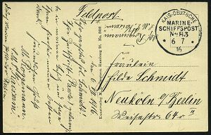 623 | 18 € | I.WELTKRIEG: DEUTSCHE MARINESCHIFFSPOST 1914 -18 : Marine-Schiffspost No. 15 1916 (18.4.) 1K-BPA: KAIS. DEUTSCHE/MARINE-/SCHIFFSPOST/No.15 = Linienschiff, I. Geschwader Hochsee-Streitkräfte , monochrome Feldpost-Ak.: S.M.S. Westfalen an Feldpost-Anschrift, schöne Kombination! | ![]() ![]() | |