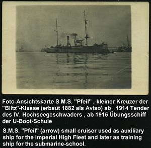 677 | 15 € | I.WELTKRIEG: DEUTSCHE MARINESCHIFFSPOST 1914 -18 : Marine-Schiffspost No. 100 1916 (ca.) individuelle s/w.-Foto-Ak.: S.M.S. Pfeil , Kleiner Kreuzer, ab 1915 Übungsschiff der U-Boot-Schule (ohne Uhv.) ungebr., seltene Karte! | ![]() | |