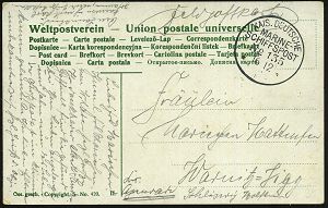 620 | 18 € | I.WELTKRIEG: DEUTSCHE MARINESCHIFFSPOST 1914 -18 : Marine-Schiffspost No. 14 1915 (11.2.) 1K-BPA: KAIS. DEUTSCHE/MARINE-/SCHIFFSPOST/No.14/** = Dampfer "General", Stationsschiff, Konstaninopel (Wohn-, Verwaltungs- u. HQ-Schiff) klar gest. Color-Feldpost-Ak.: Konstantinopel Goldes Horn n. Leipzig | ![]() ![]() | |