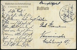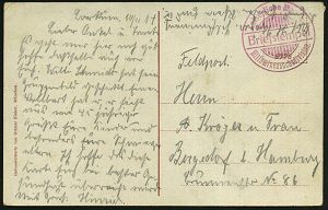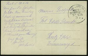 660 | 20 € | I.WELTKRIEG: DEUTSCHE MARINESCHIFFSPOST 1914 -18 : Marine-Schiffspost No.70 1916 (18.2.) 1K-BPA: KAIS. DEUTSCHE/MARINE-/SCHIFFSPOST/No.70 = S.M.S. "Amazone" , Kl. Kreuzer, bis Anfang 1916 Flaggschiff Küstenschutz-Division Ostsee , klar gest. s/w.-Feldpost-Ak: Libau = Libau-Einsatz bis 24.2. nachgesandt nach Dürenstedt/Hambg. (schwache Fleckchen), danach bis Frühjahr 1917 wurde die "Amazone" U-Boot-Zielschiff! | ![]() ![]() | |