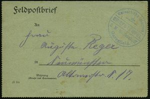 746 | 35 € | I.WELTKRIEG: DEUTSCHE MARINESCHIFFSPOST 1914 -18 : Marine-Schiffspost 1916 (3.7.) 1K-Brücke: K.D. Feldpoststation/* Nr. 168 * = Kurland (Nr.2006) + viol. 3K-Briefstempel: KOMMANDO S.M.H.(ILFSSCHIFF) WINTERTON + hs. Abs.: ".. S.M.H. Winterton, Stettin" (Einsatz Kurland), klar gest. Color-Feldpost-Ak.: Libau (Zetinje) n. Lübeck, sehr seltener Beleg!, seltenes Hilfsschiff! (kein BPA) | ![]() ![]() | |