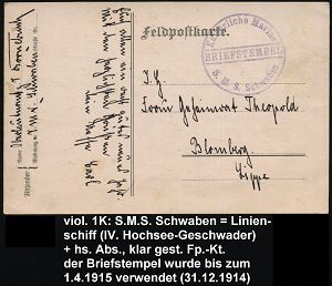 707 | 20 € | I.WELTKRIEG: DEUTSCHE MARINESCHIFFSPOST 1914 -18 : Marine-Schiffspost No. 141 1914 (31.12.) viol. 1K-Brücken-Briefstpl.: BRIEFSTEMPEL/ S.M.S. Schwaben = Linienschiff (MSP No.141) (IV. Hochsee-Geschwader) + hs. Abs., Postausrüstung erfolgte am 1.4.1915, klar gest. Feldpost-Kt. n. Blomberg | ![]() | |