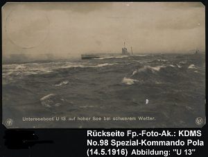 762 | 20 € | I.WELTKRIEG: UNTERSEEBOOTE / UBOOTKRIEG 1914-18 : DEUTSCHES REICH / KROATIEN 1916 (14.5.) 1K-BPA: KAIS. DEUTSCHE/MARINE-/SCHIFFSPOST/No. 98 = Marine-Spezial-Kommando, U-Boot-Stützpunkt P o l a , s/w.-Feldpost-Ak.: U-Boot "U 13" auf hoher See (Ecken gerundet) n. Lübeck, selten! | ![]() ![]() | |