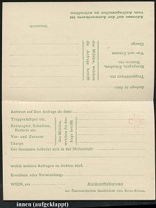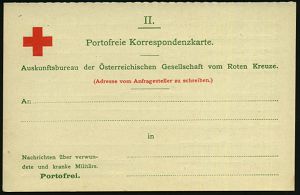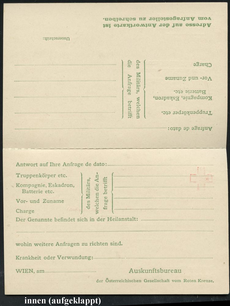 814 | 18 € | I. WELTJRIEG: ROTES KREUZ / SANITÄTSDIENSTE / LAZARETTE 1914-18 : ÖSTERREICH 1914 5 H. Sonder-P. KFJ-Jubil., grün: Auskunftsbureau der Österr. Gesellschaft vom Roten Kreuze Wien.. Kriegsschule (Nachforschung) + anhängende, portofreie Antwortkt. (Durchstich oben) ungebr. (Mi.P 200 a) | ![]() ![]() ![]() | |