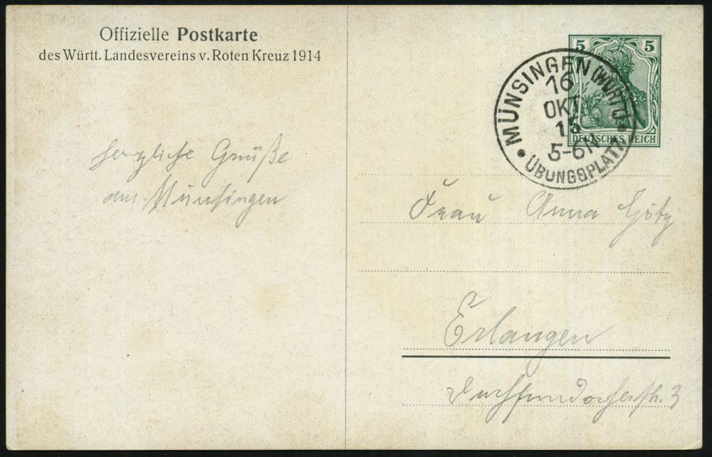 787 | 40 € | I. WELTJRIEG: ROTES KREUZ / SANITÄTSDIENSTE / LAZARETTE 1914-18 : MÜNSINGEN (Württ.)/ ÜBUNGSPLATZ 1915 (16.10.) 1K = Hauspostamt Truppenübungsplatz auf Sonder-P 5 Pf. Germania, grün: Württbg. R.K.-Landesverband = RK.-Soldaten, Verwundete (sign. Haug) klar gest. Inl.-Karte, seltene Kombination! (Mi.P 102, + 90.- EUR, 2005) | ![]() ![]() | |