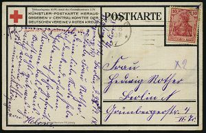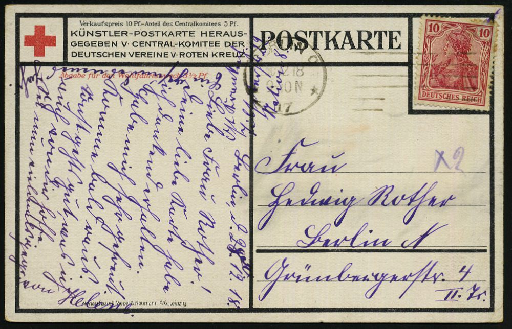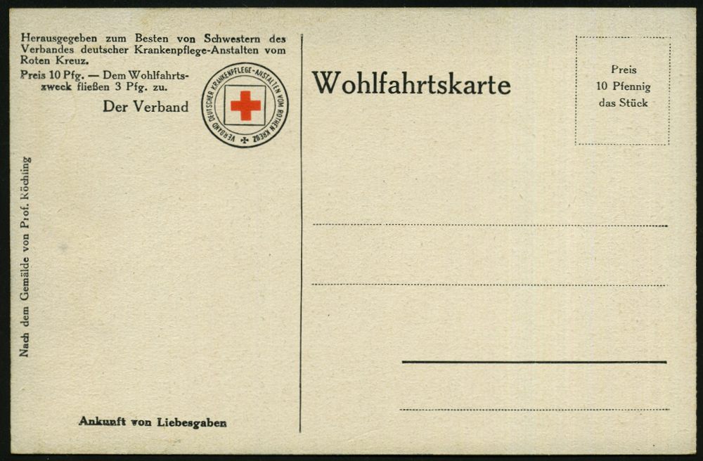 799 | 15 € | I. WELTJRIEG: ROTES KREUZ / SANITÄTSDIENSTE / LAZARETTE 1914-18 : DEUTSCHES REICH 1916 Rotkreuz-Color-Spenden-Künstler-Ak 10 Pf.: Feldpostausgabe bei der 8.Garde-Inf.Div. , sign. C. Röchling (1855-1920), berühmter Militär-Maler u. Illustrator, Meisterschüler von Anton v. Werner, ungebr. | ![]() ![]() | |