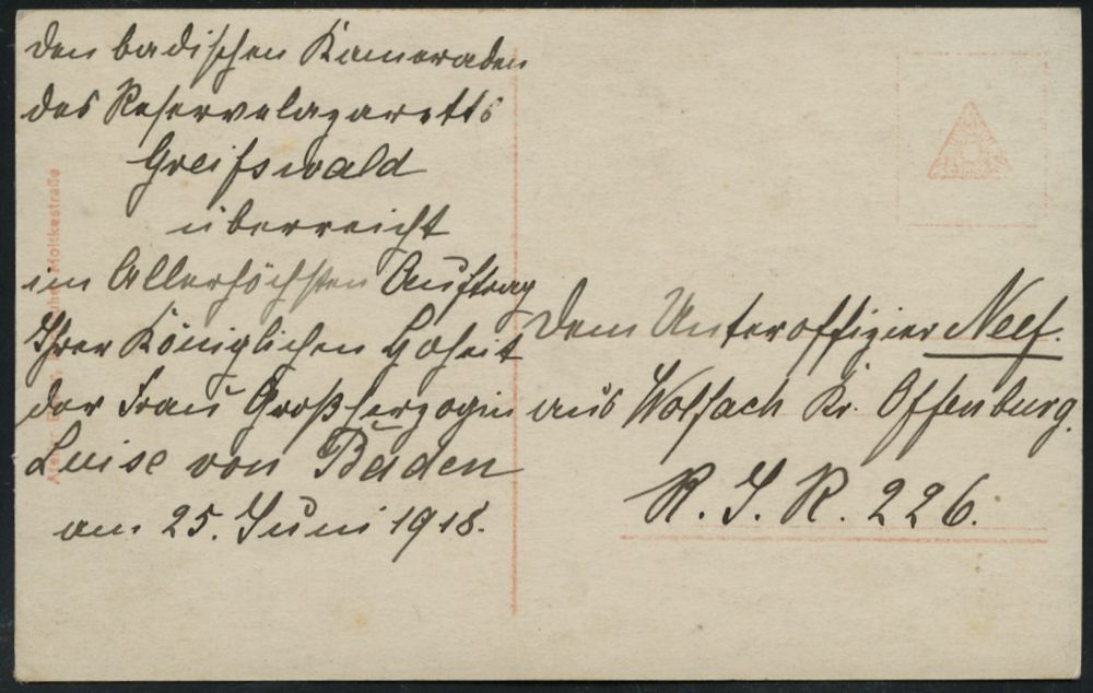 780 | 12 € | I. WELTJRIEG: ROTES KREUZ / SANITÄTSDIENSTE / LAZARETTE 1914-18 : Greifswald 1918 (25.6.) s/w.-Foto-Ak.: Großherzogin Luise von Baden als Rotkreuz-Schwester , rs. entsprechende hs. Text Res.-Lazarett Greifswald!, ungebr., Fotograf Carl Bauer, Karlsruhe (vergl. Los 5979) | ![]() ![]() | |