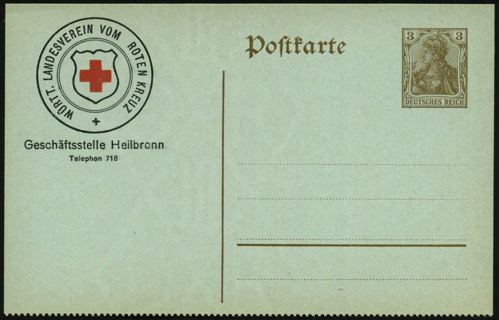 783 | 25 € | I. WELTJRIEG: ROTES KREUZ / SANITÄTSDIENSTE / LAZARETTE 1914-18 : Heilbronn 1910 amtl.P 3 Pf.Germania, u n t e n g e z ä h n t + amtl. Zudruck: WÜRTT. LANDESVEREIN VOM ROTEN KREUZ = Rotkreuz-Wappen , ungebr., selten! (Mi.PZD 89 II) | ![]() | |