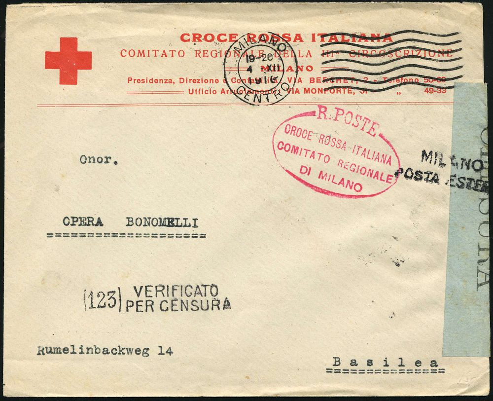 813 | 18 € | I. WELTJRIEG: ROTES KREUZ / SANITÄTSDIENSTE / LAZARETTE 1914-18 : ITALIEN 1916 (4.12.) Ma.-WellenSt: MILANO/CENTRO auf R.K.-Vordr-Bf: CROCE ROSSA ITALIANA (Milano), roter Oval-R.K.-HdN + Zensur-Streifen (blau, Wo.II) + schw. 2L: (123) VERIFICATO/PER CENSURA (Wo.1a) an die Opera Bonomelli, Basel | ![]() ![]() | |