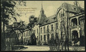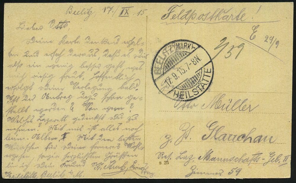 773 | 30 € | I. WELTJRIEG: ROTES KREUZ / SANITÄTSDIENSTE / LAZARETTE 1914-18 : BEELITZ (MARK) -/ H E I L S T Ä T T E 1915 (17.9.) 1K-Gitter = Hauspostamt (berühmte Tuberkulose-Klinik etc,) klar gest. s/w.-Feldpost-Ak.: Gruß aus Beelitz.. Pavillon B II (Frontseite) an Res.-Lazarett Glauchau, seltene Kombination!, Adolf Hitler wurde hier vom 9.10.-4.12.1917 behandelt (nach einer Verletzung an der Somme-Front) | ![]() ![]() | |