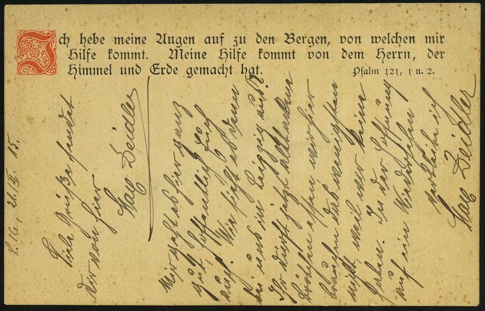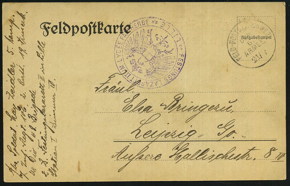 792 | 12 € | I. WELTJRIEG: ROTES KREUZ / SANITÄTSDIENSTE / LAZARETTE 1914-18 : DEUTSCHES REICH / FRANKREICH 1915 (21.2.) 1K: FELD-POSTSTATION No.7/DER/6.ARMEE (Nr.2759) + viol. 2K-HdN: FESTUNGS LAZARETT LYCÉE FAIDHERBE/ LILLE (Kaiseradler) + hs. Abs.: ".. 7. Inf. Regt. 106.. 24. Div. 48. Brigade z. Zt. Festungslazarett in Lille..", klar gest. Feldpost-Kt. mit Bibelzitat (rs.) n. Leipzig | ![]() ![]() | |