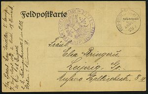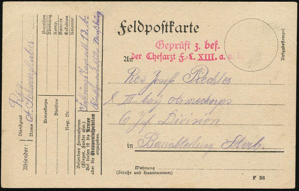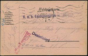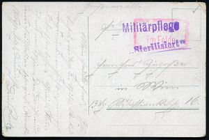 816 | 25 € | I. WELTJRIEG: ROTES KREUZ / SANITÄTSDIENSTE / LAZARETTE 1914-18 : ÖSTERREICH 1916 (17.8.) roter Zensur-Ra.: Von der Armee/im Felde + viol. 1L: "S t e r i l i s i e r t" + 1L: Militärpflege, desinfizierte Feldpost-Ak.: Krakau n. Wien | ![]() | |