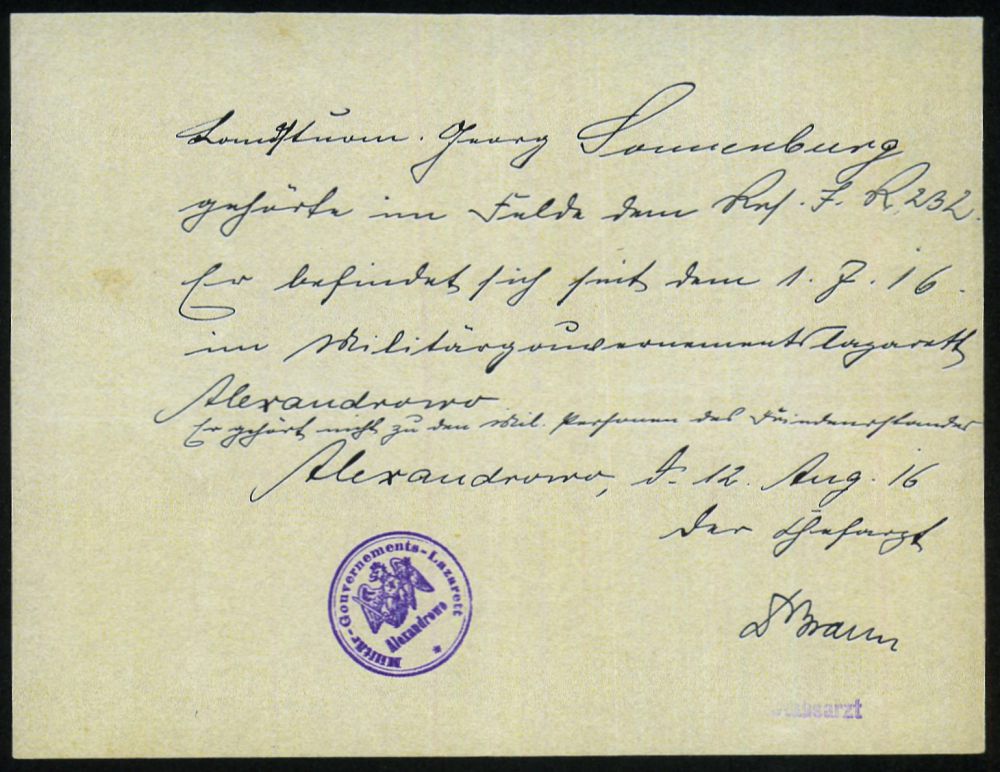811 | 12 € | I. WELTJRIEG: ROTES KREUZ / SANITÄTSDIENSTE / LAZARETTE 1914-18 : DT.BES.RUSS.-POLEN 1916 (12.8.) viol. 2K-HdN: Militär-Gouvernements-Lazarett/Alexandrowo (preuß. Adler) Bescheinigung über Anwesenheit eines Landsturmmannes im Lazarett + Stabsarzt-Signatur (Format ca. 21 x 16 cm) | ![]() | |