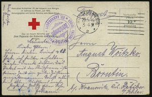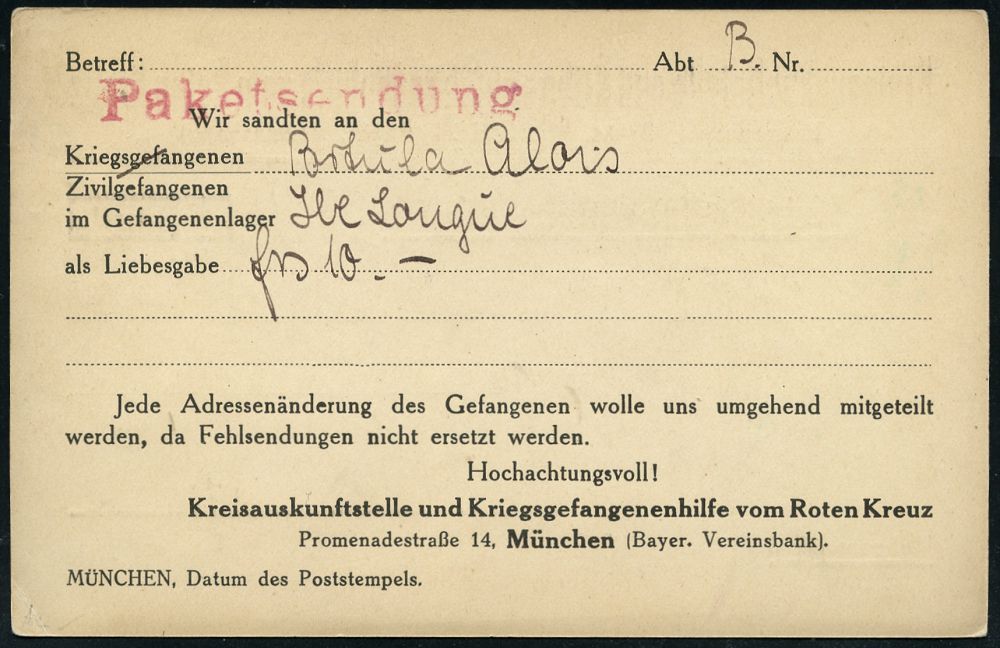 786 | 18 € | I. WELTJRIEG: ROTES KREUZ / SANITÄTSDIENSTE / LAZARETTE 1914-18 : München 1918 (17.4.) 2K + rotviol. RK-HdN: KREISAUSKUNFSTELLE UND KRIEGSGEFANGENENHILFE VOM ROTEN KREUZ auf entspr. Vordruck-Orts-Kt., rs. 1L: Paketsendung für einen Zivil-Internierten in Frankreich, Lager Ile Langue (Mi.94 EF) | ![]() ![]() | |