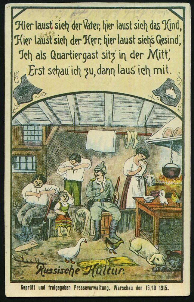 809 | 14 € | I. WELTJRIEG: ROTES KREUZ / SANITÄTSDIENSTE / LAZARETTE 1914-18 : DT.BES.RUSS.-POLEN 1915 (Okt.) Color-Propaganda-Spott-Künstler-Ak.: "Russische Kultur" über Läuse-Befall mit Zensur-Vermerk: Warschau Geprüft.. 15.10.1915 (Uhv. J.K.M.) ungebr. | ![]() | |