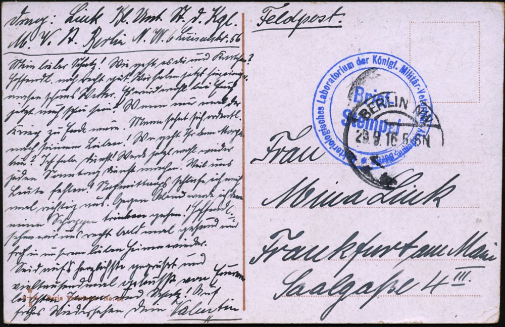 776 | 25 € | I. WELTJRIEG: ROTES KREUZ / SANITÄTSDIENSTE / LAZARETTE 1914-18 : BERLIN NW 7 1916 (29.9.) 1K-Brücke + blauer HdN: Bakteriolog. Laboratorium der Kgl. Militär-Veterinär-Akademie , seltene Feldpost-Ak. n. Frankfurt/M. | ![]() | |