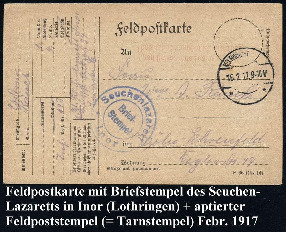 802 | 25 € | I. WELTJRIEG: ROTES KREUZ / SANITÄTSDIENSTE / LAZARETTE 1914-18 : DEUTSCHES REICH 1917 (16.2.) aptierte 1K-Brücke: K. D. Feldpost/* * (Tarnstempel) + blauer 2K-HdN: S e u c h e n l a z a r e t t / Inor (= Lothringen) klar gest. Feldpost-Kt. n. Köln | ![]() | |