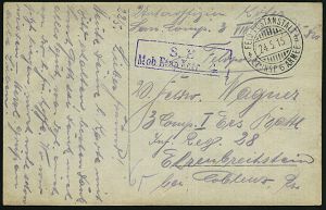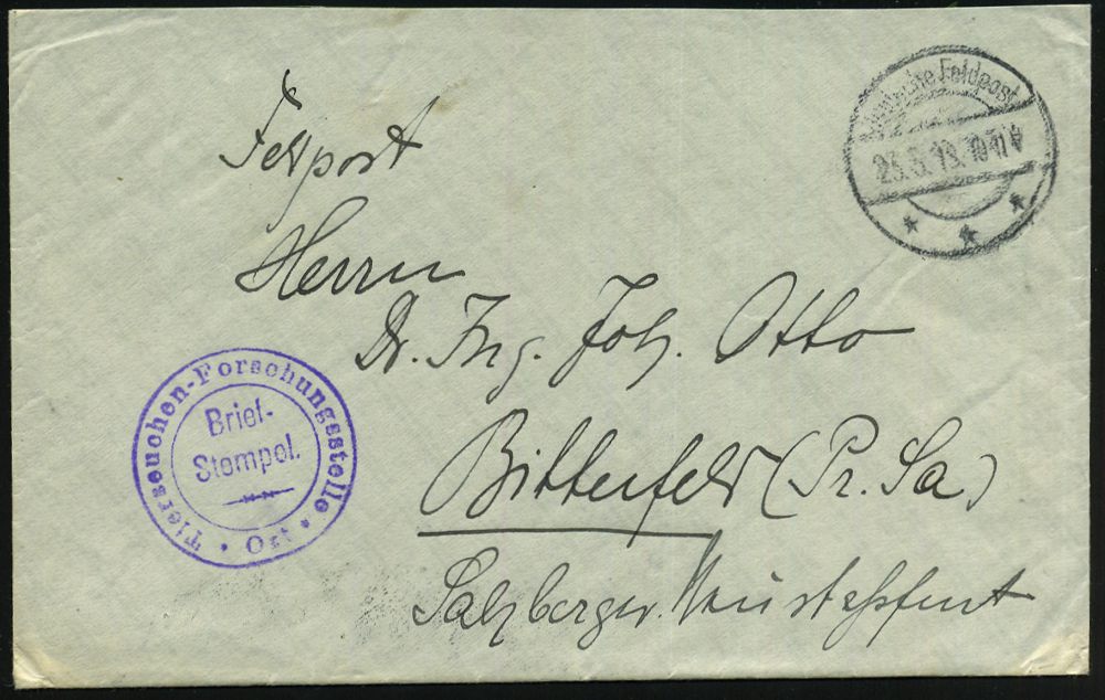 806 | 25 € | I. WELTJRIEG: ROTES KREUZ / SANITÄTSDIENSTE / LAZARETTE 1914-18 : DEUTSCHES REICH 1918 (23.3.) 1K-Brücke: Deutsche Feldpost/*** = Tarnstempel + viol. 2K-HdN: T i e r s e u c h e n - Forschungsstelle/Ost + rs. hs. Abs., Feldpost-Bf. n. Bitterfeld, seltene Einheit! | ![]() ![]() | |
