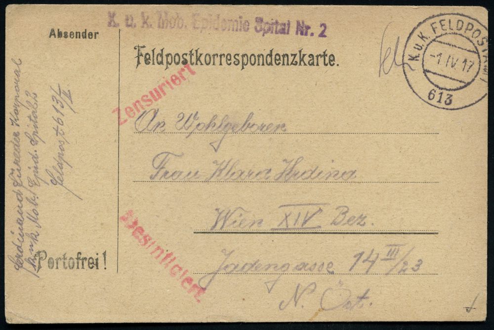 818 | 25 € | I. WELTJRIEG: ROTES KREUZ / SANITÄTSDIENSTE / LAZARETTE 1914-18 : ÖSTERREICH 1917 (1.4.) 2K-Steg: K. u. K. FELDPOSTAMT/613 (rechts nicht ganz voll) + viol. 1L: K. u. k. Mob.(iles) E p i d e m i e - Spital Nr.2 + roter 1L: D e s i n f i c i e r t + roter 1L: Zensuriert, klar gest., desinfizierte Feldpost-Zensur-Kt. n. Wien | ![]() | |