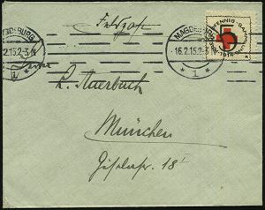 784 | 15 € | I. WELTJRIEG: ROTES KREUZ / SANITÄTSDIENSTE / LAZARETTE 1914-18 : MAGDEBURG/ *1* 1915 (16.2.) Band-MaSt auf 5 Pf. Rotkreuz-Spendenmarke "KREUZ PFENNING-SAMMLUNG 1914" , klar gest., kleiner Feldpost-Bf. | ![]() | |