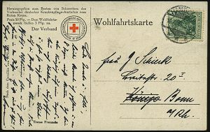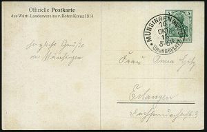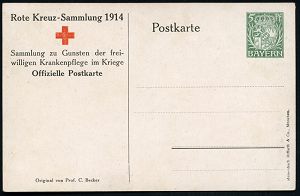 791 | 25 € | I. WELTJRIEG: ROTES KREUZ / SANITÄTSDIENSTE / LAZARETTE 1914-18 : BAYERN 1914 PP 5 Pf. Hupp-Wappen, grün: R.K.-Sammlung 1914 mit RK-Kutsche, RK-Offz. zu Pferd, Personal mit RK-Schwester (Verletzter auf Bahre) ungebr. (Frech.PP 38/C 7-03) | ![]() ![]() | |