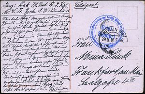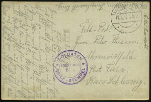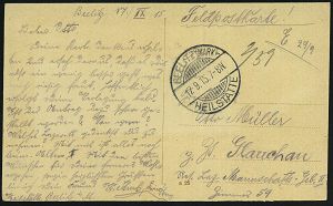810 | 18 € | I. WELTJRIEG: ROTES KREUZ / SANITÄTSDIENSTE / LAZARETTE 1914-18 : DT.BES.RUSS.-POLEN 1915 (13.9.) 1K-Brücke: Feldpoststation/Et.Insp.9.Armee (teils nicht voll) + klarer viol.1K-HdN: S e u c h e n abteilung Spaethe/9.Armee , Fp.-Ak. (Warschau) n. Minden | ![]() ![]() | |