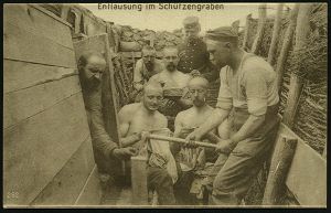 798 | 12 € | I. WELTJRIEG: ROTES KREUZ / SANITÄTSDIENSTE / LAZARETTE 1914-18 : DEUTSCHES REICH / ELSASS 1915 (ca.) monochrome Spott-Ak.: Entlausung im Schützengraben = Soldat tötet Laus mit einem Beil! (Uhv. Verlag Julius Berger, Metz) mit Zulassungs-Vermerk!, ungebr. | ![]() | |