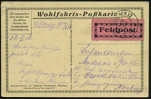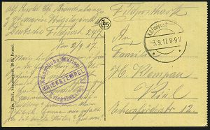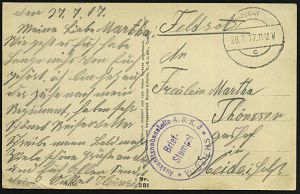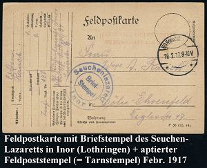 805 | 25 € | I. WELTJRIEG: ROTES KREUZ / SANITÄTSDIENSTE / LAZARETTE 1914-18 : DEUTSCHES REICH 1917 (18.8.) aptierte 1K-Brücke: K.D. Feldpost = Tarnstempel + viol. 2K-HdN: S e u c h e n l a z a r e t t / Inor + 2L: Sendet keine Lebensmittel mehr.., klar gest. Feldpost.-Ak. (Forges, Westfront) n. Wiedenbrück, seltene Einheit! | ![]() ![]() | |