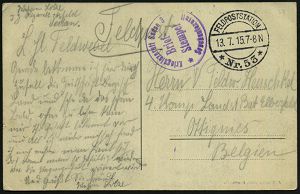 808 | 10 € | I. WELTJRIEG: ROTES KREUZ / SANITÄTSDIENSTE / LAZARETTE 1914-18 : DT.BES.BELGIEN 1917 (3.9.) aptierte 1K-Brücke: K. D. Feldpost/** = Tarnstempel + viol. 1K-Steg-HdN: Kaiserliche marine/ Kriegslazarett II + hs. Abs.: ".. Marine Lazarett II, Deutsche Feldpost 247", klar gest. Feldpost-Ak.: Ypern, Rijselpoort n. Kiel | ![]() ![]() | |