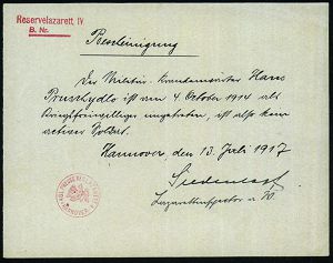 782 | 12 € | I. WELTJRIEG: ROTES KREUZ / SANITÄTSDIENSTE / LAZARETTE 1914-18 : Hannover 1917 (13.7.) roter 1K-HdN: KGL. PREUSS. LAZARETT 4/HANNOVER + roter 2L: Reservelazarett IV.. , Bescheinigung über einen Militär-Krankenanwärter seit 4.10.1914 mit Signatur (Format ca. 21 x 16,5 cm) | ![]() | |