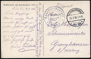 801 | 25 € | I. WELTJRIEG: ROTES KREUZ / SANITÄTSDIENSTE / LAZARETTE 1914-18 : DEUTSCHES REICH 1916 (28.9.) 1K-Brücke: K. D. Feldpoststation/* Nr. 94 * (HB Nr.1843) + schw.-viol. 2K-HdN: S e u c h e n lazarett Inor + hs. Abs.: "..zur Zeit Kriegslazarett Jnor..", klar gest. Feldpost-Künstler-Ak.: Schliersee | ![]() ![]() | |