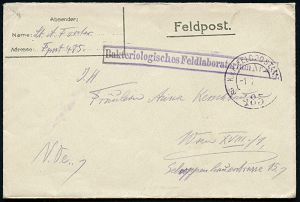 817 | 25 € | I. WELTJRIEG: ROTES KREUZ / SANITÄTSDIENSTE / LAZARETTE 1914-18 : ÖSTERREICH 1917 (1.10.) 1K-Segment: K.u.k. FELDPOSTAMT/a/485 + viol. Ra.: Bakteriologisches Feldlaboratorium Nr.40 , Feldpost-Bf. + Inhalt n. Wien, 2 Belege kompl.!, seltene Einheit! | ![]() ![]() | |