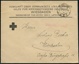 789 | 25 € | I. WELTJRIEG: ROTES KREUZ / SANITÄTSDIENSTE / LAZARETTE 1914-18 : WIESBADEN/ *1z 1919 (27.2.) 1K-Brücke + roviol. 1L: Kriegsgefangenen-Sendung! , Rorkreuz-Dienst-Bf.: AUSKUNFT ÜBER VERWUNDETE UND VERMISSTE, HILFE FÜR KRIEGSGEFANGENE DEUTSCHE, WIESBADEN.. (Kreuz) portofreier Orts-Bf. = WASt-Vorläufer !, deutsche Kgf. wurden gegen Verstoß der Haager Landkriegsordnung von 1899 z. T. bis 1922 festgehalten! | ![]() | |