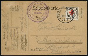 796 | 18 € | I. WELTJRIEG: ROTES KREUZ / SANITÄTSDIENSTE / LAZARETTE 1914-18 : DEUTSCHES REICH 1915 (22.8.) Feldpost-1K: K. D. FELDPOST-EXPEDITION/4.ERS.-DIV/* b auf RK-Spendenmarke 1 Pf. "Pfennig-Sammlung" (Schr.783) + viol. 3K-HdN: Maschinengewehr Komp. Jnf. Regt. 361, klar gest. Feldpost-Kt. n. Saarbrücken | ![]() | |