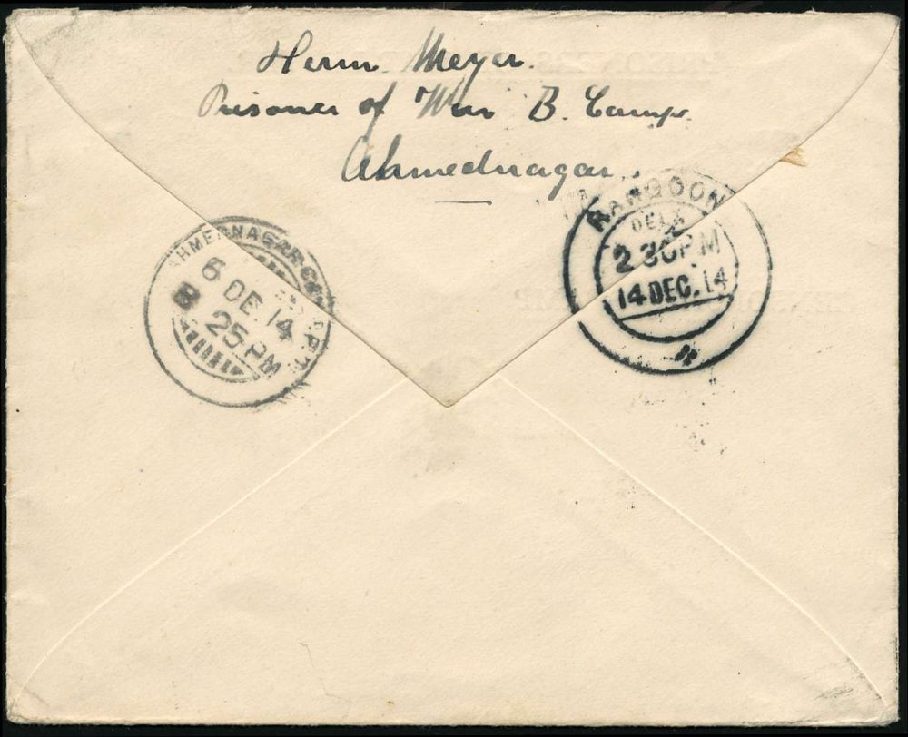 845 | 40 € | I. WELTKRIEG: KRIEGSGEFANGENENPOST 1914-18 : INDIEN 1914 (5.12.) Kgf.-Vordruck-Bf.: PRISONERS OF WAR-LETTER/ CENSORSHIP STAMP/..Prisoner of War/Ahmednagar + grüner Datums-HdN, rs. Aufgabe-Stpl.,Kgf.-Bf. eines Deutschen an seine nicht internierte Frau in Rangoon, Burma! (rs.AS), sehr selten! | ![]() ![]() | |